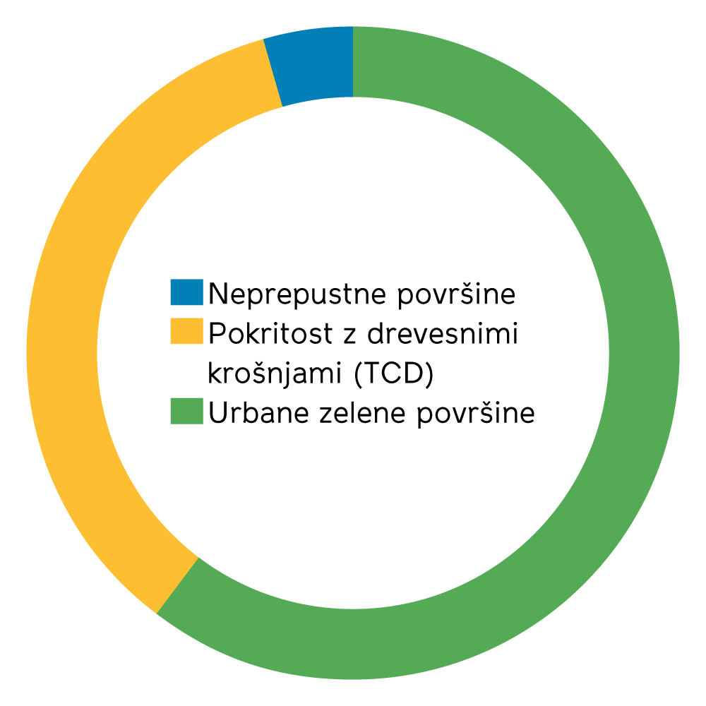 Slika 2: Deleži zelenih, drevesnih in neprepustnih površin v Mestni občini Kranj.